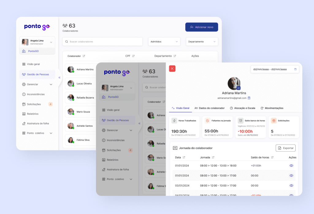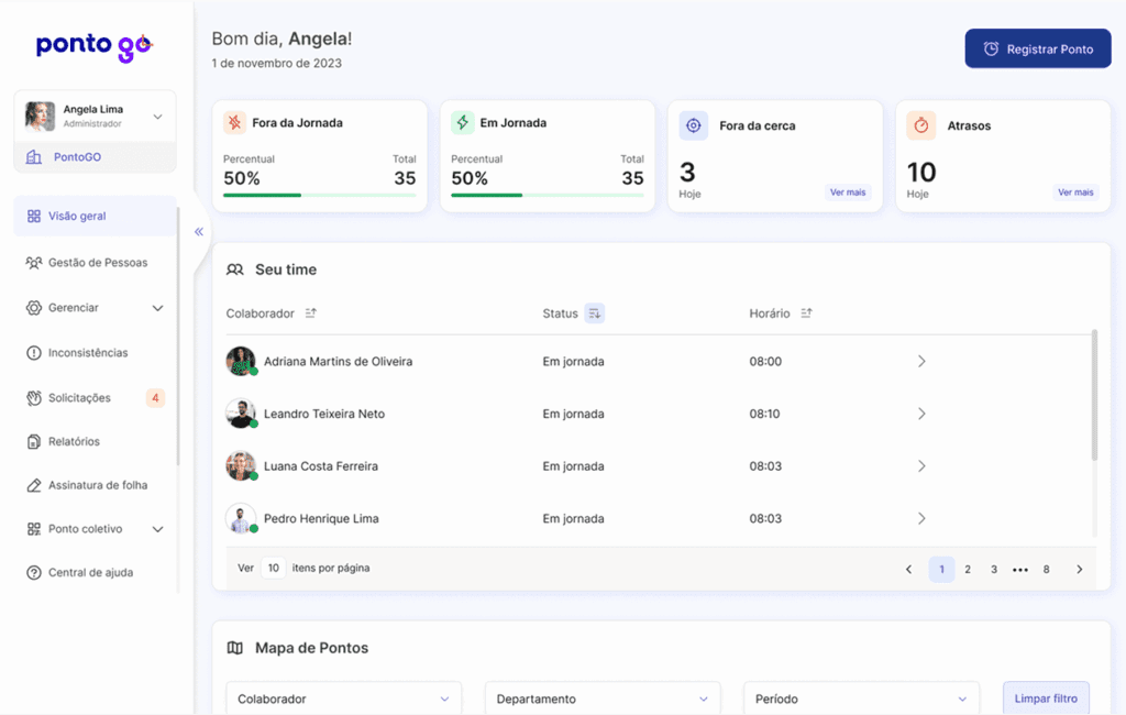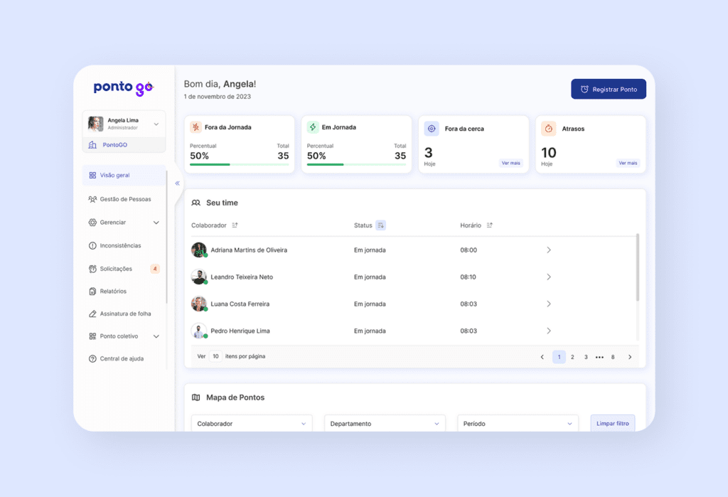 Na plataforma web da PontoGO é possível ter uma visão geral dos seus colaboradores.