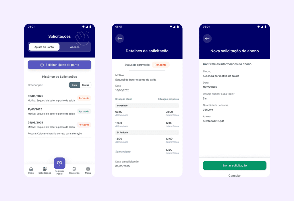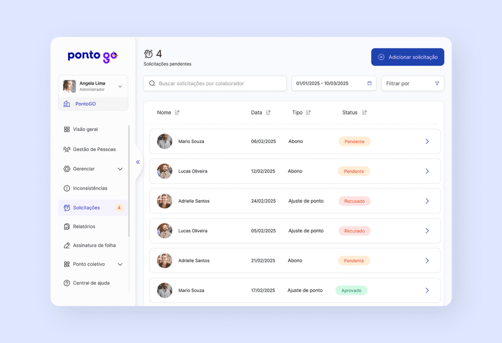 Controle todas as solicitações de ajuste de pontos e abonos em um único lugar de forma simples.