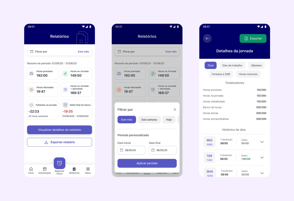Acesse o detalhamento completo da sua jornada e tenha transparência total sobre suas horas trabalhadas e banco de horas.